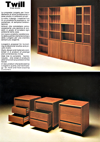 The series includes design solutions of the living area, sleeping area, and study / executive office. Twill 1977 | LONGATO ARREDAMENTI | Collaborazione S. Renko e A. Calandrin © Viezzoli & Vision s.r.l. | Proprietà riservata. Tutti i diritti riservati a norma di legge. Riproduzione anche parziale vietata senza la nostra autorizzazione scritta.